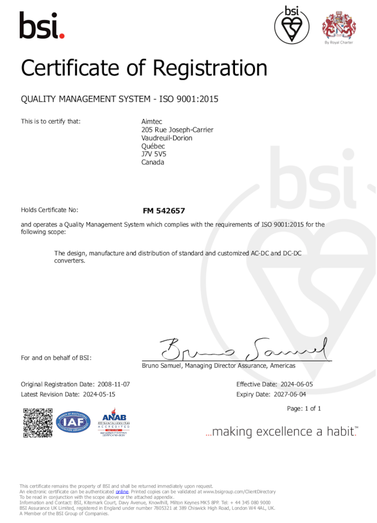 Как компания ISO 9001:2015, Aimtec следует строгим процедурам контроля качества для всех своих линеек продукции с 100% испытаниями на отказ и военным производственным стандартом (MIL STD 105D), а также сертификацией агентства по мировым стандартам (включая IEC/UL/CE/TUV/NOM).