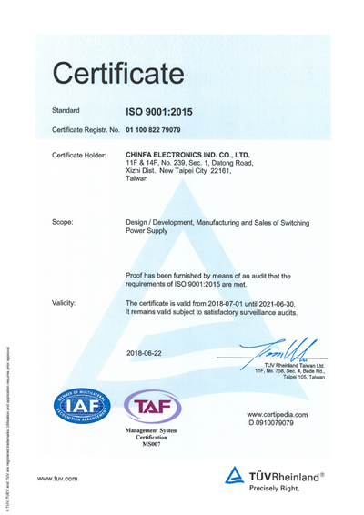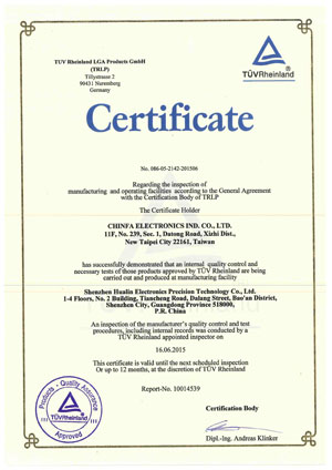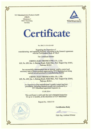 Продукция CHINFA соответствует международным стандартам по электромагнитной совместимости и электробезопасности, что подтверждено сертификатами UL, CSA, TUV, CE. Система менеджмента качества компании соответствует стандарту ISO 9001. Также вся продукция CHINFA сертифицирована по стандарту ГОСТ Р.