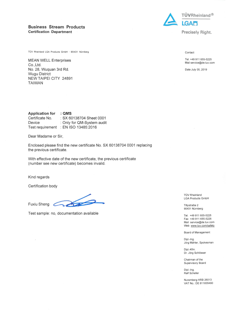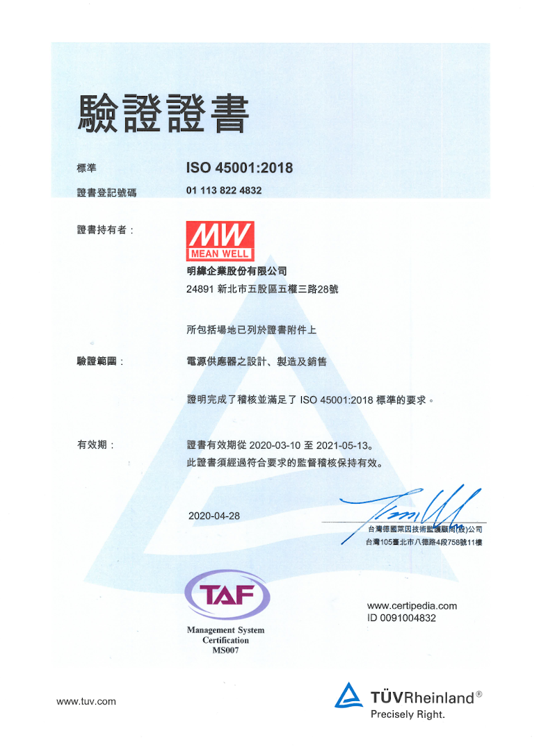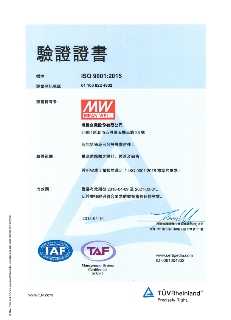 Продукция MEAN WELL соответствует международным стандартам по электромагнитной совместимости и электробезопасности, что подтверждено сертификатами UL, cUL, CSA, TUV, CE. Система менеджмента качества компании соответствует стандарту ISO 9001.